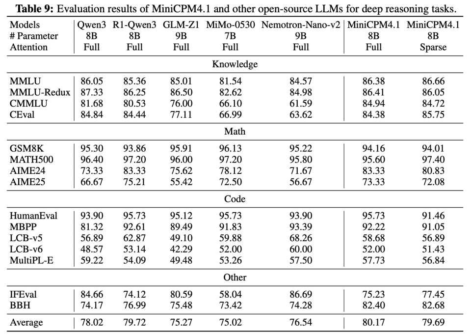 MiniCPM4.1在众多深思考任务上取得综合平均分同尺寸模型第一。