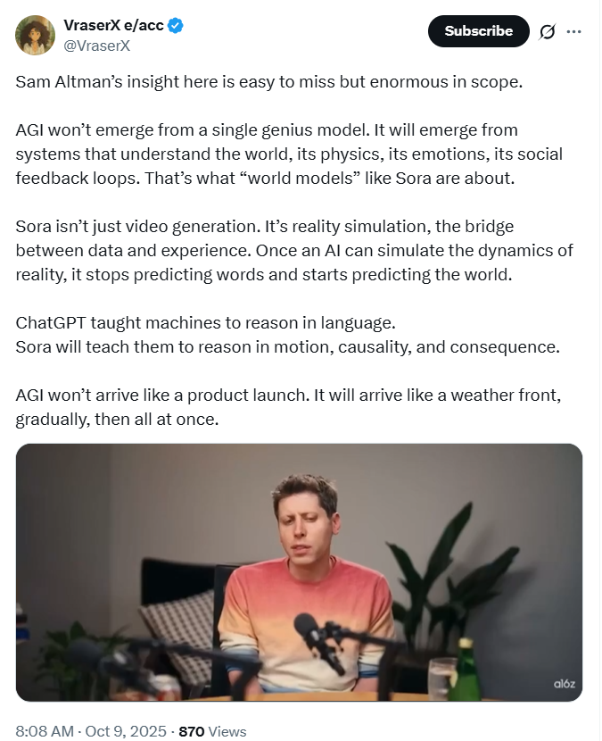 分析师VraserX在X平台上的解读:Sora不只是视频生成,而是现实模拟——当AI开始预测世界,而不是预测词语,AGI的门就被推开。ChatGPT 教会机器用语言思考,而Sora将让它们学会在运动与因果中思考。
