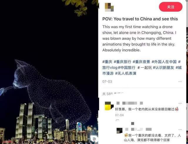 每逢节假日,无人机烟花秀在夜空绚丽开幕。6月17日,重庆11787架无人机蜂群组成的巨大山茶花更是以“最多无人机组成的空中图案”刷新世界纪录,现场将近10万人,来自世界各地的外国游客接连称赞。