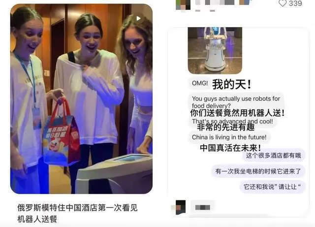 “我只是在App上点了一下,几分钟后一个机器人就出现在我的酒店房门前,递给我一瓶水。这整个过程没有任何人机交互,高效得令人难以置信,这在美国是无法想象的。”