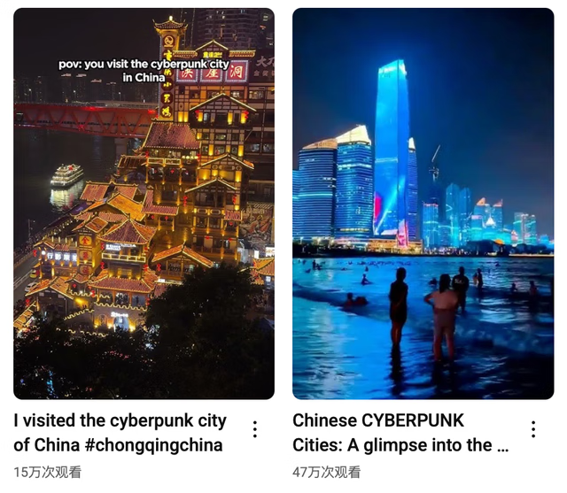 我们能看到,在YouTube、TikTok等平台上,“Cyberpunk China”“China Tech”等标签下的内容呈爆炸式增长,单个视频播放量破百万。无数外国博主发布的视频里,无人机将外卖送往长城、机器人在格斗现场互殴、自助结账的无人超市被称为“i人天堂”。