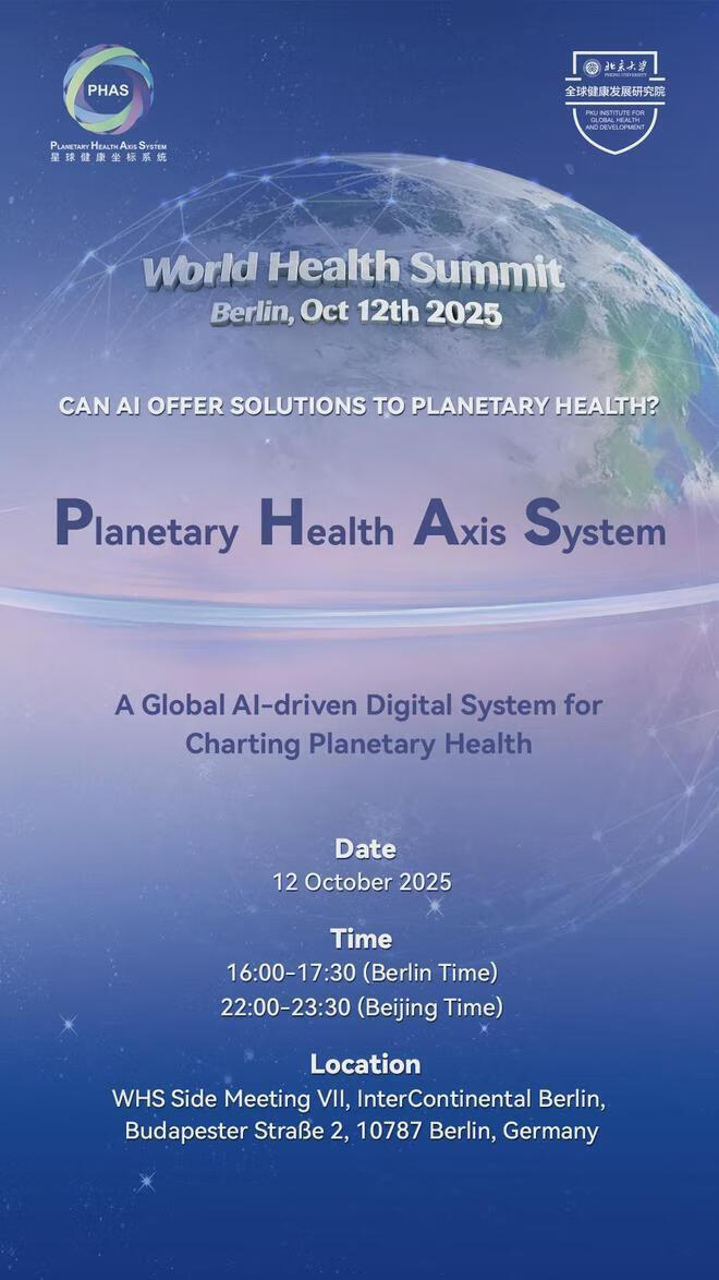 10月10日消息,北京大学“星球健康坐标系统(PHAS)”将于德国时间10月12日16:00-17:30在柏林举行的“世界健康峰会2025”上进行全球首发。为构建人类命运共同体贡献力量,助力全球治理、星球健康与人类可持续发展。