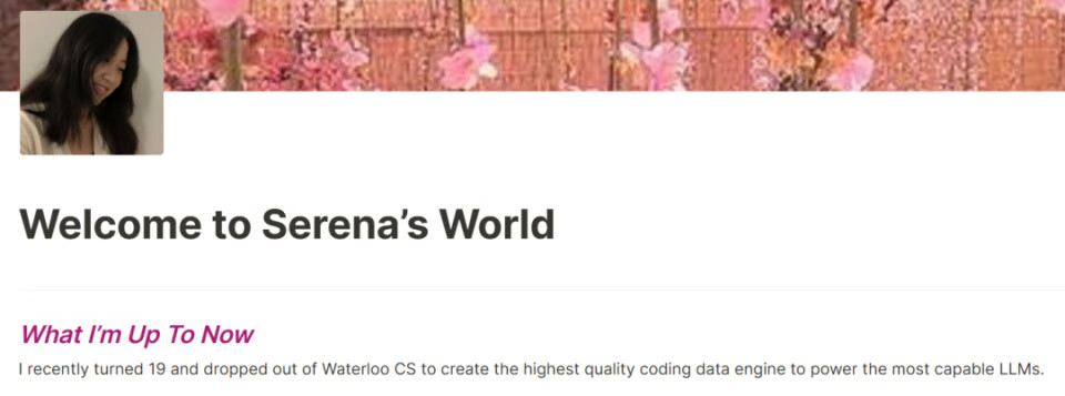 “我最近刚满 19 岁,从加拿大滑铁卢大学计算机学院退学(创业),致力于创建最高质量的编码数据引擎,为最强大的大模型提供支持。”不久前,出生于加拿大的亚裔女孩 Serena Ge 在自己的个人网站上写下这段话。