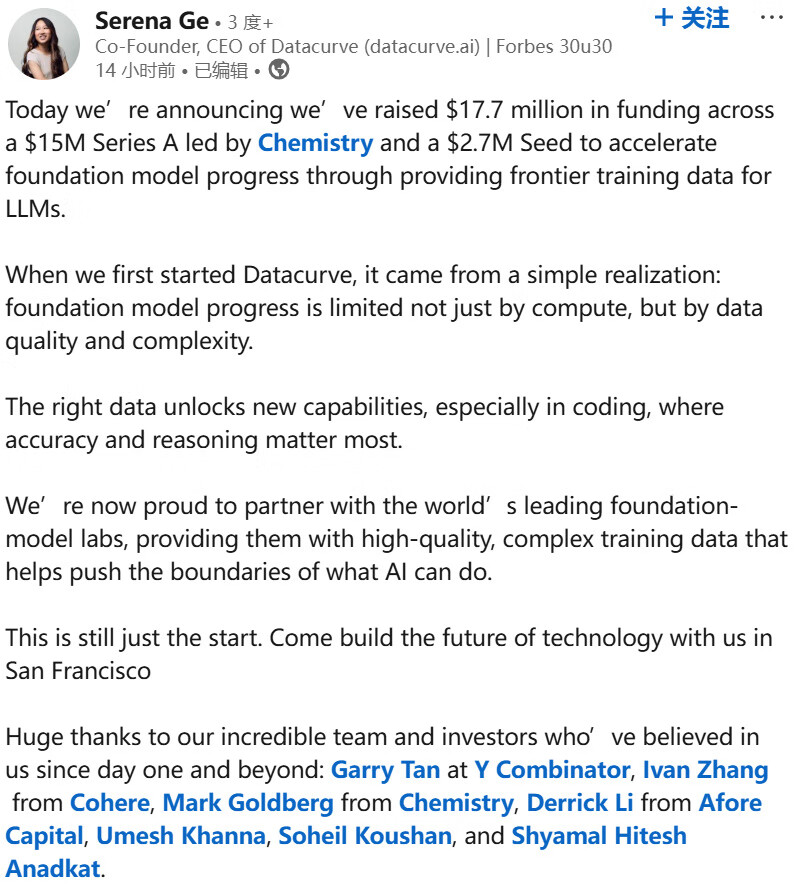 Datacurve创始人Serena Ge的相关主页https://www.linkedin.com/in/serena-ge-4583731b4/和https://www.instagram.com/serenaa.ge/和https://serenage.super.site/