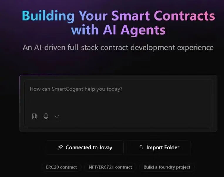 Jovay已经向开发者发布了智能合约开发助手SmartCogent,能用AI自动写合约、自动查漏洞、自动管发布。这是一个AI驱动的、全栈开发工具,实现了各种编程语言一键生成;机器快速扫描代码安全问题;还管理测试、打包、上线整套流程。