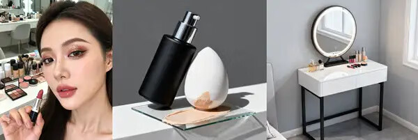 提示词:图1坐在图3前,先拿起图2的粉底液,用美妆蛋以“点涂+轻拍”动作均匀上脸(特写手部发力细节),接着对着镜子微笑展示妆效(捕捉嘴角上扬+眼神亮泽的表情)。镜头从“手部操作近景→面部上妆中景→微笑特写”切换,全程保持博主妆容、梳妆台物品位置不变。
