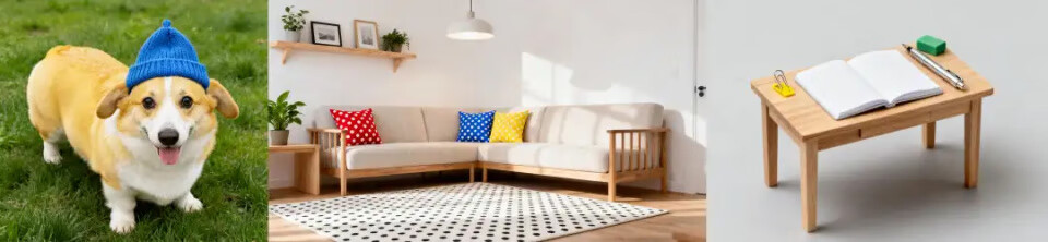 这一视频中客厅背景的绿植、沙发造型,小桌子上的笔记本、笔、橡皮以及柯基头上佩戴的蓝色帽子位置都与参考图一致,且镜头也符合提示词要求的的先用低角度仰拍再全景展示。