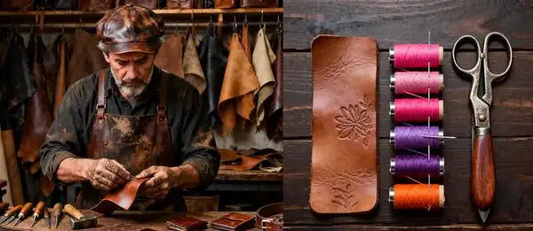 提示词:图1在演示皮具缝制:先将图2的皮革对齐,再用针线回针缝(特写针脚密度),全程保持皮革纹理、工具摆放位置不变。
