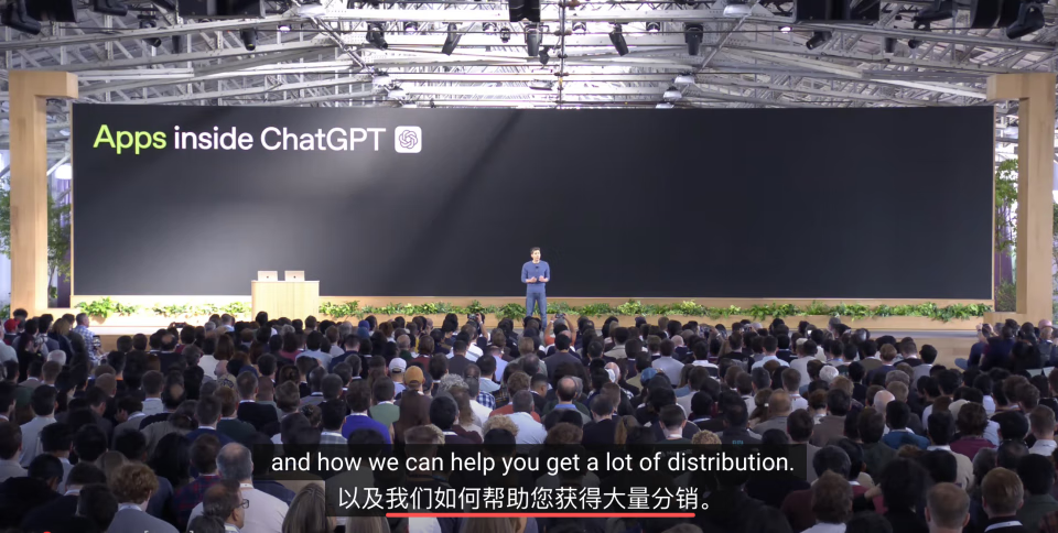 奥特曼在 2025 OpenAI 开发者大会上说,会给 ChatGPT内置应用(Apps in ChatGPT)分发更多的流量。