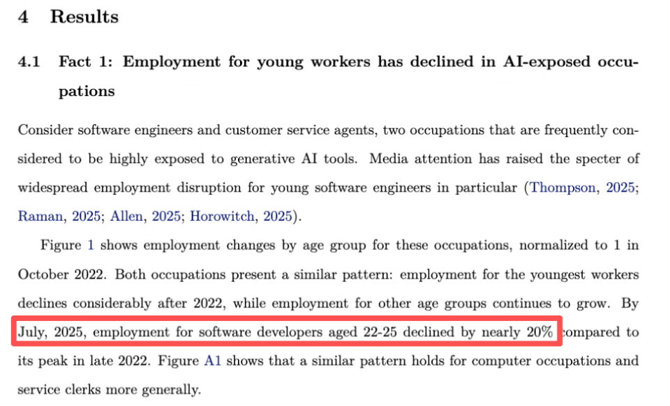 斯坦福大学三位经济学家最近进行的一项研究《Canaries in the Coal Mine? Six Facts about the Recent Employment Effects of Artificial Intelligence》发现,人工智能已经导致软件开发人员的职位空缺减少。