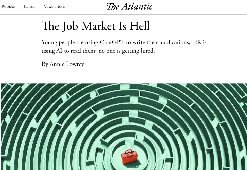 于是,在某些场景中又出现了令人啼笑皆非的闹剧。前不久《大西洋月刊》 刊登了一篇标题直白的文章:就业市场简直就是地狱。文章描述了求职者和招聘经理都面临的令人沮丧的境况:「年轻人用 ChatGPT 写申请,HR 用 AI 阅读申请,结果却没人被录用。」