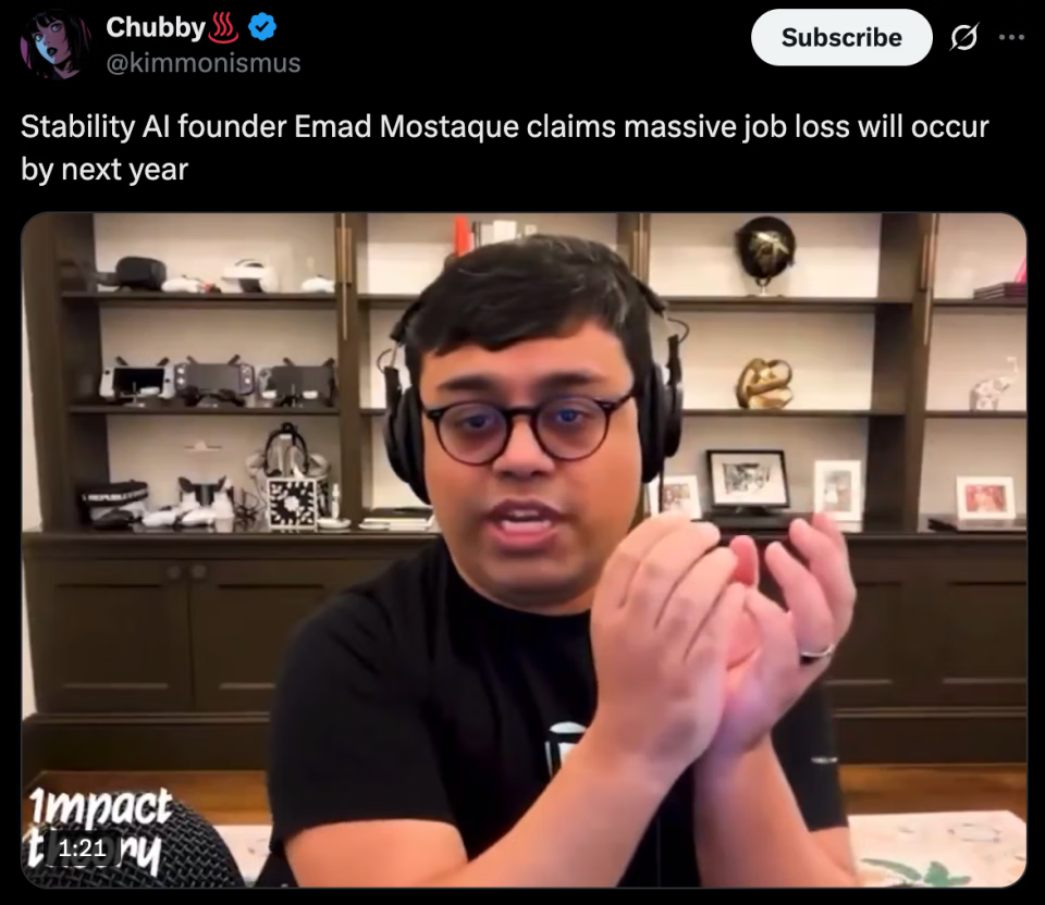 Stability AI 联合创始人 Emad Mostaque 声称,明年将出现大规模失业。「AI 能够完成复杂的工作且不出错,这将导致许多工作面临被替代风险。失业问题将同时影响多个行业,并且在未来一到两年内可能会加剧。」