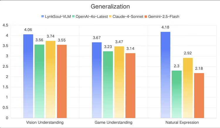 Binson: 我们大概用了半年多,就是今年(2024年)年初,拿着我们积累的数据来做这件事。我们的视觉语言模型LynkSoul VLM v1,在游戏场景中表现超越了GPT-4o、Claude-4-Sonnet和Gemini-2.5-Flash等一众顶尖通用模型。