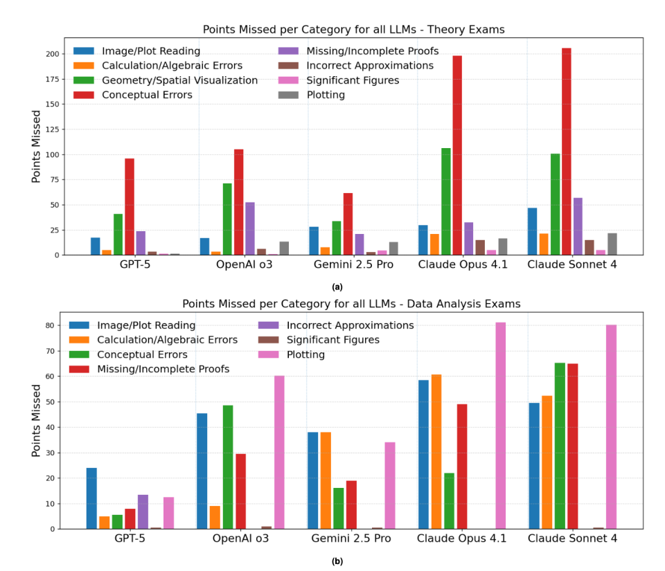 在数据分析考试中,错误在不同类别中分布更为均匀。主要的故障模式包括绘图和图表 / 图像阅读,这在 OpenAI o3 和 Claude 模型中尤为突出。由于对大型数据集进行大量计算,计算错误比理论考试中更常见。