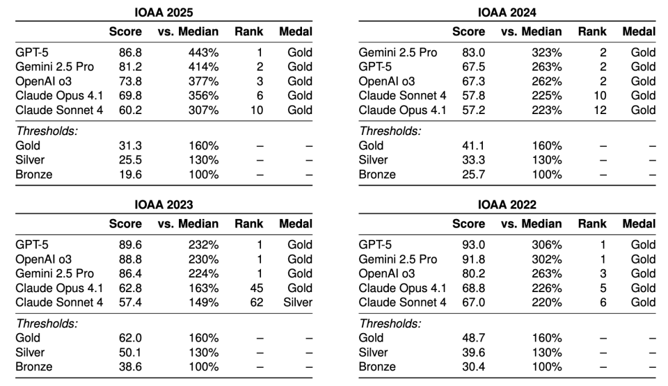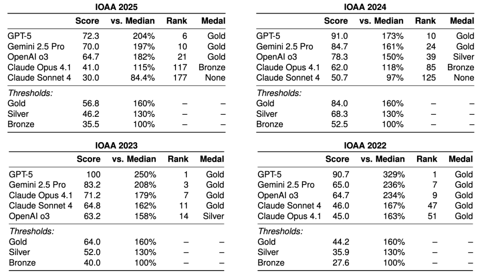 就在最近,一篇全新发布的论文中,将国际天文学和天体物理学奥林匹克竞赛 (IOAA) 作为基准测试,证明了 GPT-5 和 Gemini 2.5 Pro 两大模型能够在天文和天体物理学中取得奥赛金牌成绩。