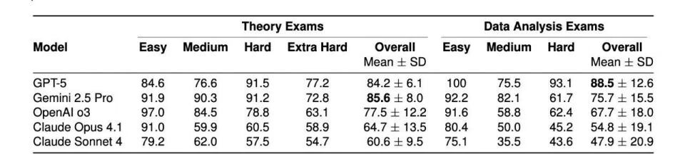 虽然 LLM 在理论考试中接近顶尖人类水平,但数据分析考试更能揭示其细粒度的能力结构与局限。GPT-5 在数据分析部分取得了 88.5% 的平均分,反而高于其理论考试表现(84.2%)。这种提升与其他模型形成鲜明对比 —— 其他 LLM 的数据分析得分普遍比理论试题下降了 10~15 个百分点。