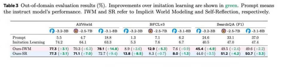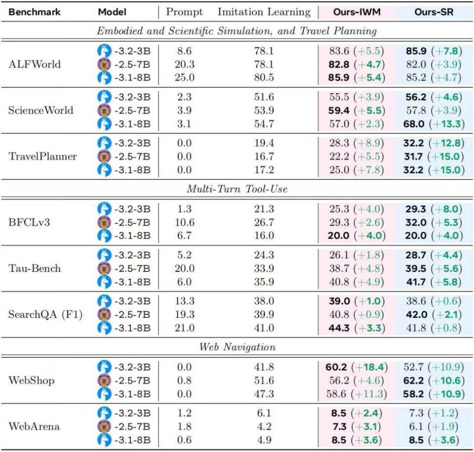 Meta 列出了基准测试的结果,所有数值均为成功率(%)。Prompt 表示指令调优模型的性能表现。IWM 和 SR 分别代表隐式世界建模与自我反思。