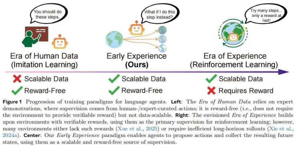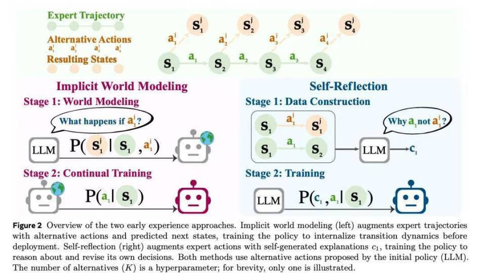 他们创新性地尝试使用一种介于模仿学习与强化学习之间的中间范式来解决上述问题,它被称为「早期经验」:智能体不仅从人工整理的数据中学习,还从自身在环境中执行动作后产生的未来状态中学习。这些未来状态代表着智能体的「自身经验」,可以被转化为监督信号,使其能够直接从行动后果中成长,而无需依赖外部奖励。