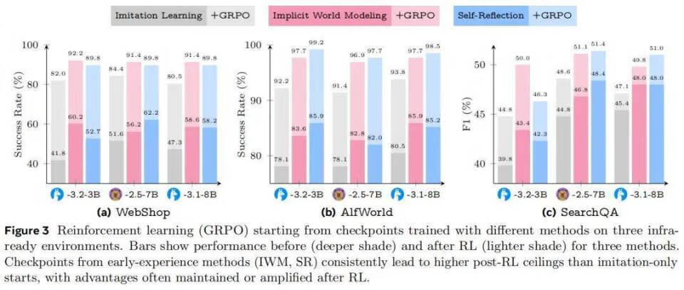 可见,在几乎所有场景和两种模型规模下,早期经验的提升效果都优于模仿学习。隐式世界建模(IWM)在结构化模拟器和交易类网站中表现稳定,自我反思(SR)则在需要多步骤推理和约束满足的任务中进步最大。