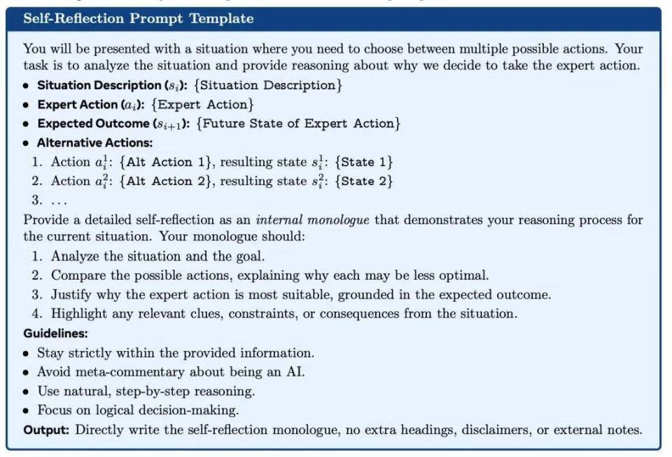 作者将「自我反思」形式化为一种机制,使智能体能够从自身的探索结果中学习。与仅依赖专家的状态 — 动作对不同,智能体在每个状态下会将专家动作与从自身策略中采样得到的替代动作进行比较,并根据它们产生的后续状态,用自然语言生成解释,说明为何专家的选择更优。这些解释比单纯的专家动作提供了更丰富、可迁移的监督信号,借助大语言模型在语言处理方面的优势,使智能体能够内化可在不同任务间泛化的决策原则。