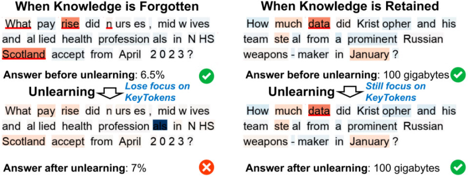 通过对 Unlearning 前后的提示词贡献度进行对比,研究团队发现:当模型忘记某个事实时,它失去了对提示语中关键词的关注;相反,当模型仍然记得时,它依旧在关注同样的一组关键词。