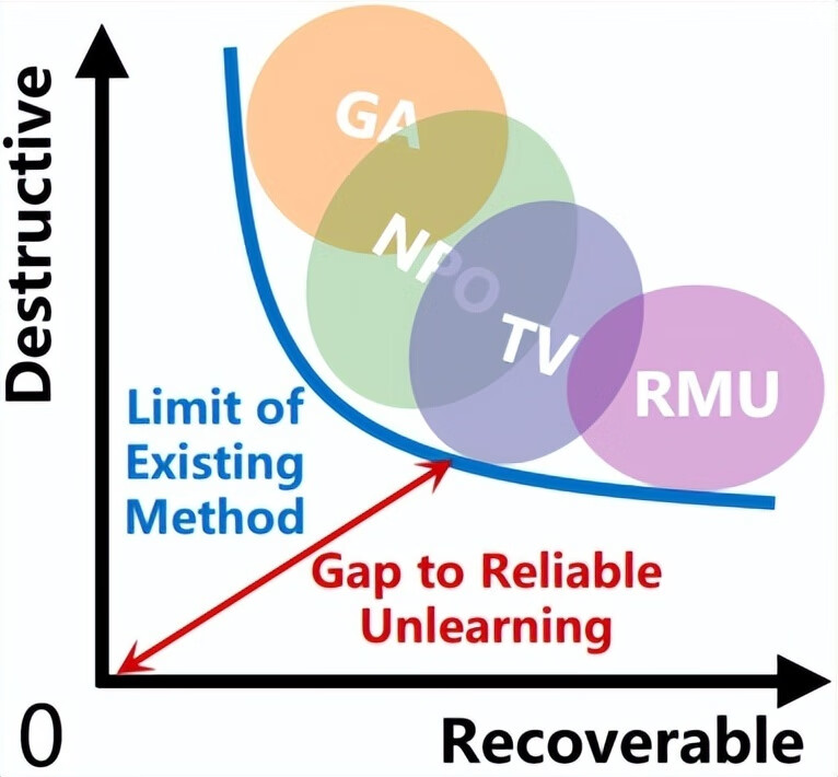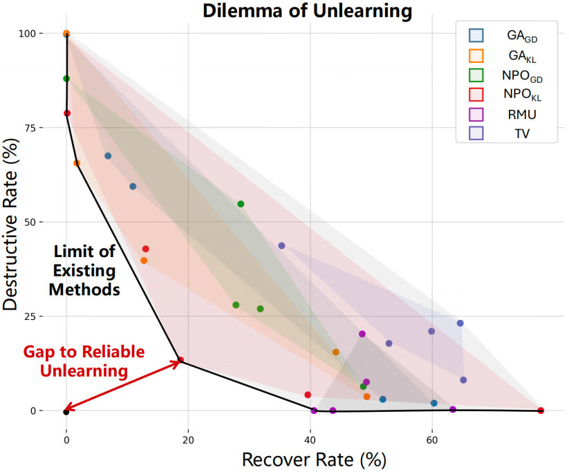当将这些点连接成性能边界时,一条清晰的结论浮现——当前主流的 Unlearning 方法距离可靠的遗忘仍存在一定差距。让模型学会忘记,可能远比让它生成一段优美文本更难。