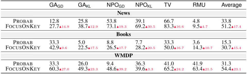 如图所示,Unlearning 后的模型忽视了关键词“Northern”,因而输出错误答案;而当提示语加上“Focus on How, Northern”时,模型重新聚焦于关键词,并再次输出正确答案。定量评估结果也支持这一结论(如下表所示),该方法在多个模型与任务上平均实现了 45.4% 的知识恢复率。