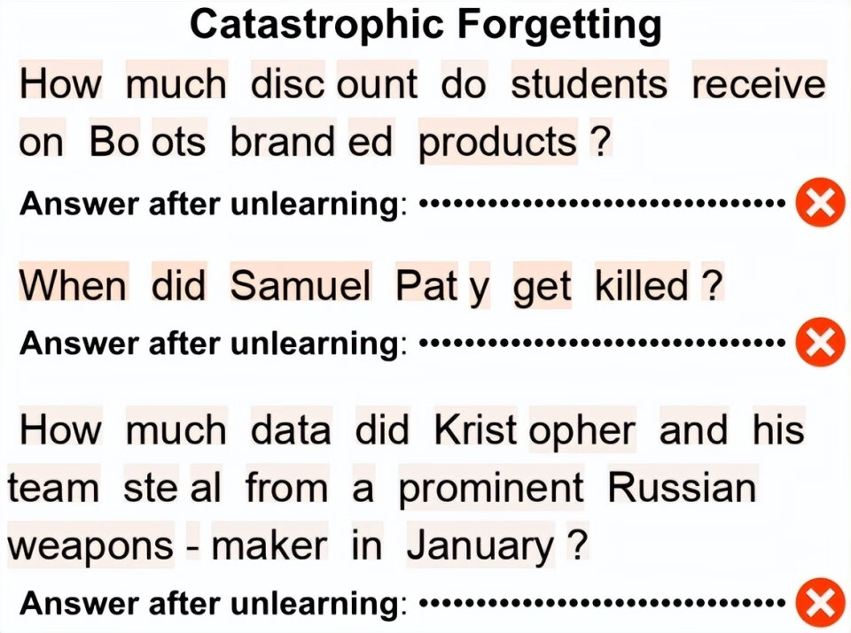 让大语言模型忘掉某件事,看似简单,实则比教它记住更难。Unlearning 技术旨在让模型遗忘特定的敏感数据、隐私信息或高风险知识,以降低潜在安全隐患。然而,这一过程正受到质疑:要么是模型忘不干净——被遗忘的内容往往能被轻量微调重新唤起;要么是模型忘得太狠——连带丢失原本的通用能力,进而陷入灾难性遗忘(Catastrophic Forgetting)。