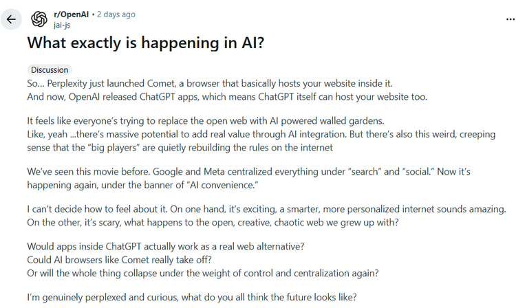最近,AI圈发生了两件看似普通的事:Perplexity推出了Comet浏览器,OpenAI发布了ChatGPT应用功能。但在Reddit的OpenAI社区,这两个消息引发了一场关于"AI是否正在杀死开放互联网"的激烈讨论。