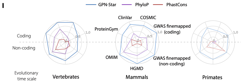 PhyloP和PhastCons分数在三种进化时间尺度下也呈现出类似趋势,但在每一种时间尺度下,GPN-Star表现都优于二者(图2I)。