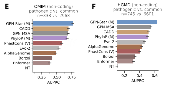 评测用OMIM与HGMD,评测结果GPN-Star(M)双基准夺冠(图2E、F)。