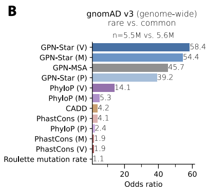 研究人员进一步进行量化分析,关注模型评分分布中「最具约束力」的尾部区间。如图5B所示,三种GPN-Star模型在稀有变异富集上均明显优于PhyloP、PhastCons和CADD。
