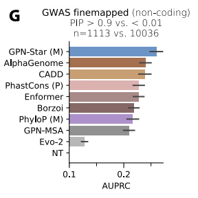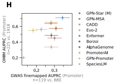 对于位于启动子区域的精细定位变异,GPN-Star(M)再次超越了所有模型,包括PromoterAI、SpeciesLM和GPN-Promoter(图2H)。