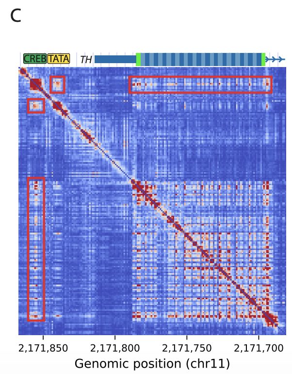 在编码酶酪氨酸羟化酶的TH基因启动子及首个外显子区域中,研究人员观察到两个强依赖模块: