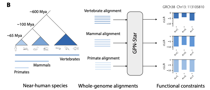 GPN-Star(Genomic Pretrained Network with Species Tree and Alignment Representations,融合物种进化树与序列比对表示的基因组预训练神经网络),是一种基因组语言模型,它的灵感来自经典进化模型,目标是画出演化轨迹。
