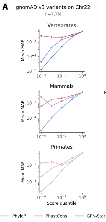 为了评估模型对等位基因频率与约束关系的捕捉能力,研究人员选取了这三种模型在脊椎动物、哺乳动物和灵长类三个不同进化时间尺度上的版本,对gnomAD v3中第22号染色体的全部变异进行了预测(该染色体未用于GPN-Star模型训练)。
