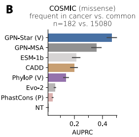 研究人员用COSMIC数据库评估了GPN-Star体细胞错义变异的预测性能,结果GPN-Star(V)明显优于所有对比模型,表现出极强的体细胞致病性预测能力(图2B)。