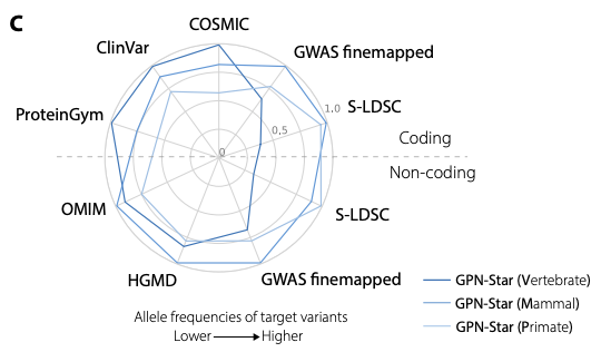 其中,GPN-Star(V)在错义变异中表现最优,而GPN-Star(M)则在同义与非编码变异方面领先,这一趋势与先前基准测试中的观察结果一致。