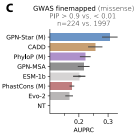 为了进一步评估GPN-Star的实用价值,研究人员还测试了它在对来自英国生物银行(UK Biobank)65个性状的GWAS(全基因组关联研究)精细定位错义变异中,区分潜在因果变异与非因果变异的能力。