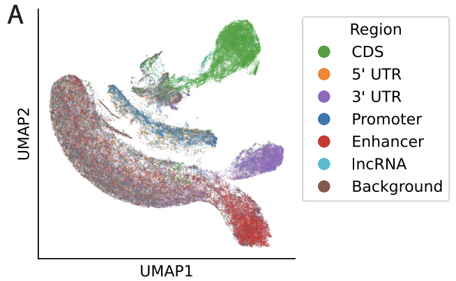 为探究这一点,研究人员可视化了基因区、cCRE和背景区的基因组窗口嵌入(图4A)。