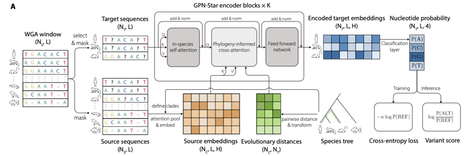 该模型是纯编码器,以掩码语言建模(MLM)为目标训练,输入跨物种WGA窗口和系统发育树。
