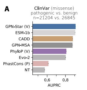对比PhyloP、PhastCons、CADD、以及新一代多物种GLM(如Nucleotide Transformer 2.5B、Evo-2 40B 和 GPN-MSA)之后,GPN-Star (V) 在精确率-召回曲线面积(AUPRC)方面表现最佳,与蛋白语言模型 ESM-1b相当(图 2A)。
