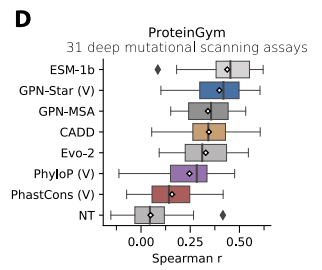 研究人员还在ProteinGym的31个DMS数据集上测试,GPN-Star(V)为基因组级最佳,仅略逊蛋白专用ESM-1b(图2D)。