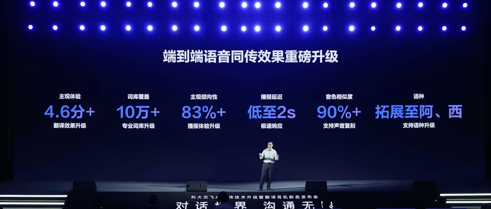 在技术向,升级了端到端同传大模型;同时在商业化方面,首发AI翻译耳机新品、翻译机再迭代。