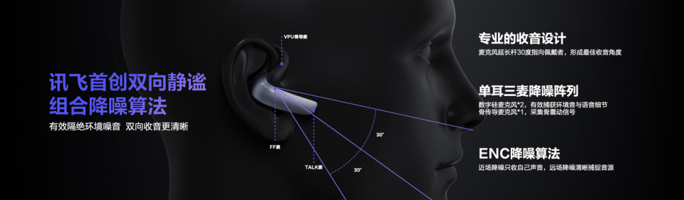 在硬件设计上,科大讯飞AI翻译耳机同样实现了创新突破——采用了「骨导+气导」设计,一个多感融合AI降噪系统。