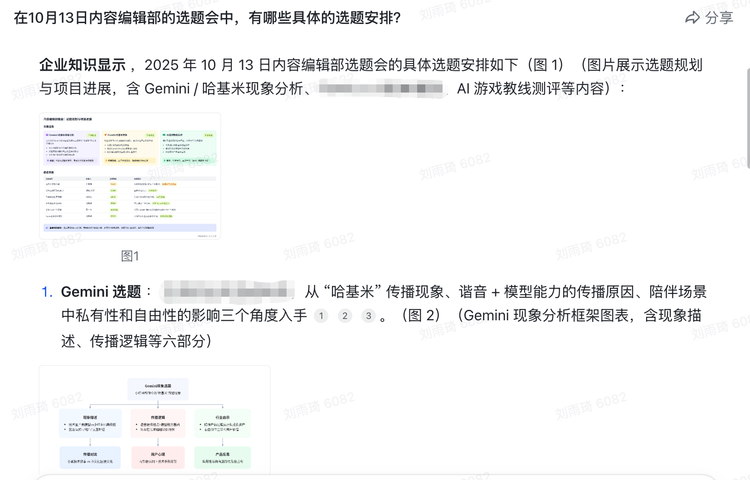 例如,我们在飞书知识问答里询问此次会议中的选题安排,它能够快速先找到一览图,并根据会议纪要整理出所有的选题安排。这种将会议内容转化为可检索、可调用、可分析的“活”知识的能力,正是实现会议资产价值最大化的利用。