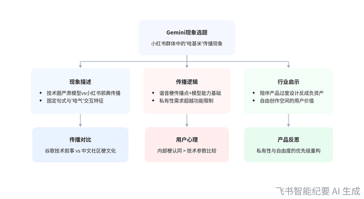 在全局性的导览图之外,当讨论深入到某一重要且复杂的议题时,智能会议纪要能够将其提炼并生成思维导图,用以梳理思路、沉淀分析框架。例如,当我们在选题中探讨“Gemini为何能成为大模型中的‘哈基米’”这一选题时,会议中多方观点交织。最终,AI从这些讨论中自动归纳出一个逻辑清晰的分析框架,并以思维导图的形式直观呈现,为负责该选题的作者提供了明确的创作指引。