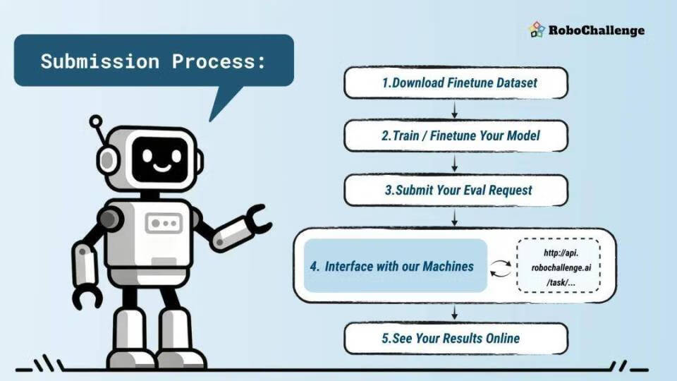 提交前需对接平台 API:通过提供框架代码,演示观察 - 推理 - 停止的完整交互逻辑,支持评估前的模型预热与动作队列稳定控制,并配套模拟测试以供验证。提交评估时需注明密钥、任务集及模型名称,多任务提交将视作通用模型处理。