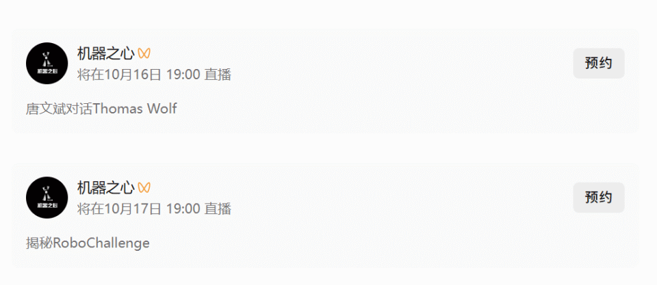 RoboChallenge 全球首发同时还有两场相关主题的重磅直播,欢迎关注机器之心视频号预约观看!