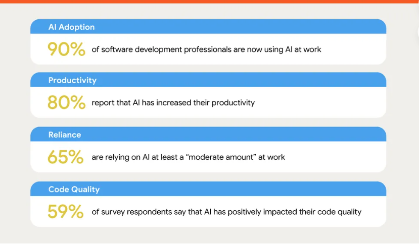 根据报告显示,高达90%的开发者已经在日常工作中使用AI,这一比例比去年上涨了14%